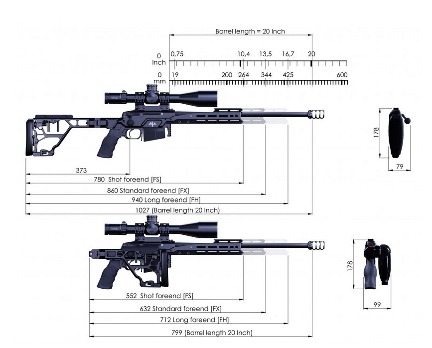 Both AKILA buttstocks are machined out of 7075 T651 aluminium billets and have a black hard coat anodized finish and features QD sling swivels sockets on both sides. Both buttstocks offer a possibility to adjust the cheek piece height and side, the length of pull, recoil pad height. Besides that Buttstock M features a built-in quick deployable and fine adjustable monopod and buttstock Lite has one MLOK™ slot to mount a monopod or a custom bag rider. The buttstock mounting point of the AKILA chassis is compatible with AR-15 receiver extensions, which will allow installing AR butt stocks. The buttstock folding can be user configured and folds to left or right sides of the chassis.