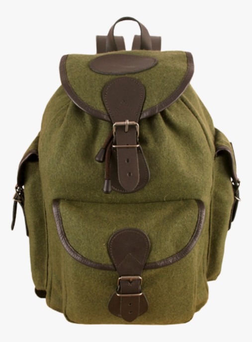 aus lodenähnlichem Stoff, innen Nylonfutter, mit gepolstertem Rücken und gepolsterten Ledertrageriemen